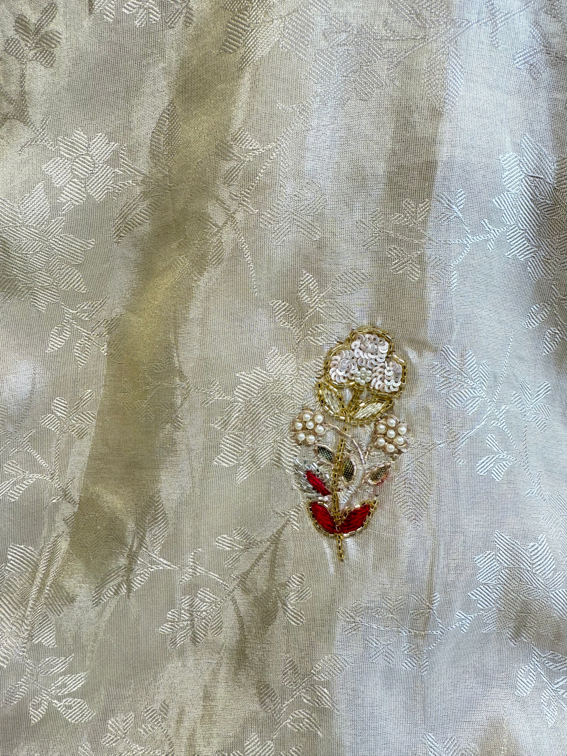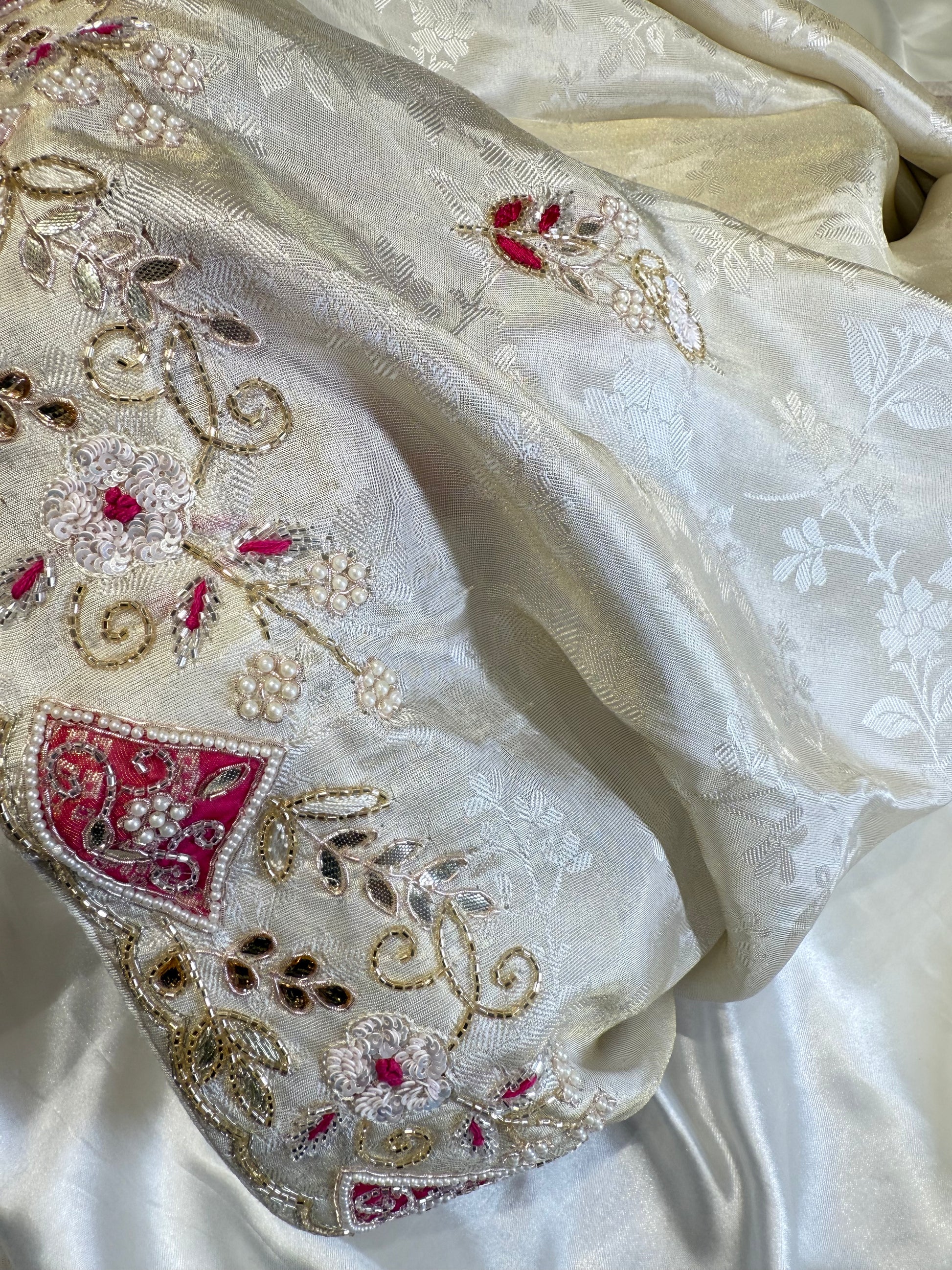This exquisite Brocade Silk saree in Beige is a timeless masterpiece, featuring intricate designer embroidery that adds a touch of grandeur and sophistication. The luxurious fabric and delicate embroidery make it the perfect choice for weddings, receptions, and festive occasions, ensuring you stand out with elegance and style.