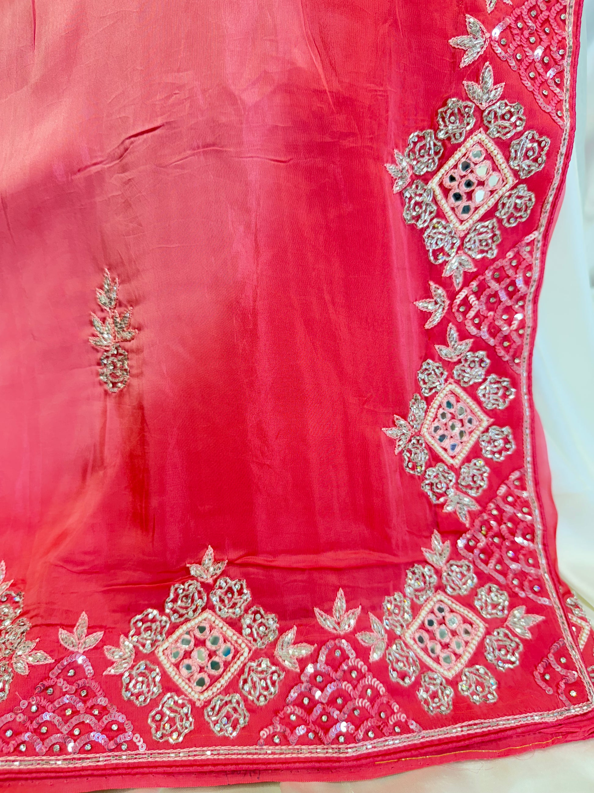 This stunning Chiniya Silk saree in a soft pink hue is a true testament to craftsmanship. The exquisite handwork details enhance the luxurious silk fabric, making it the perfect choice for special occasions. Its delicate pink shade, combined with the intricate handwork, brings a sense of timeless beauty and sophistication.