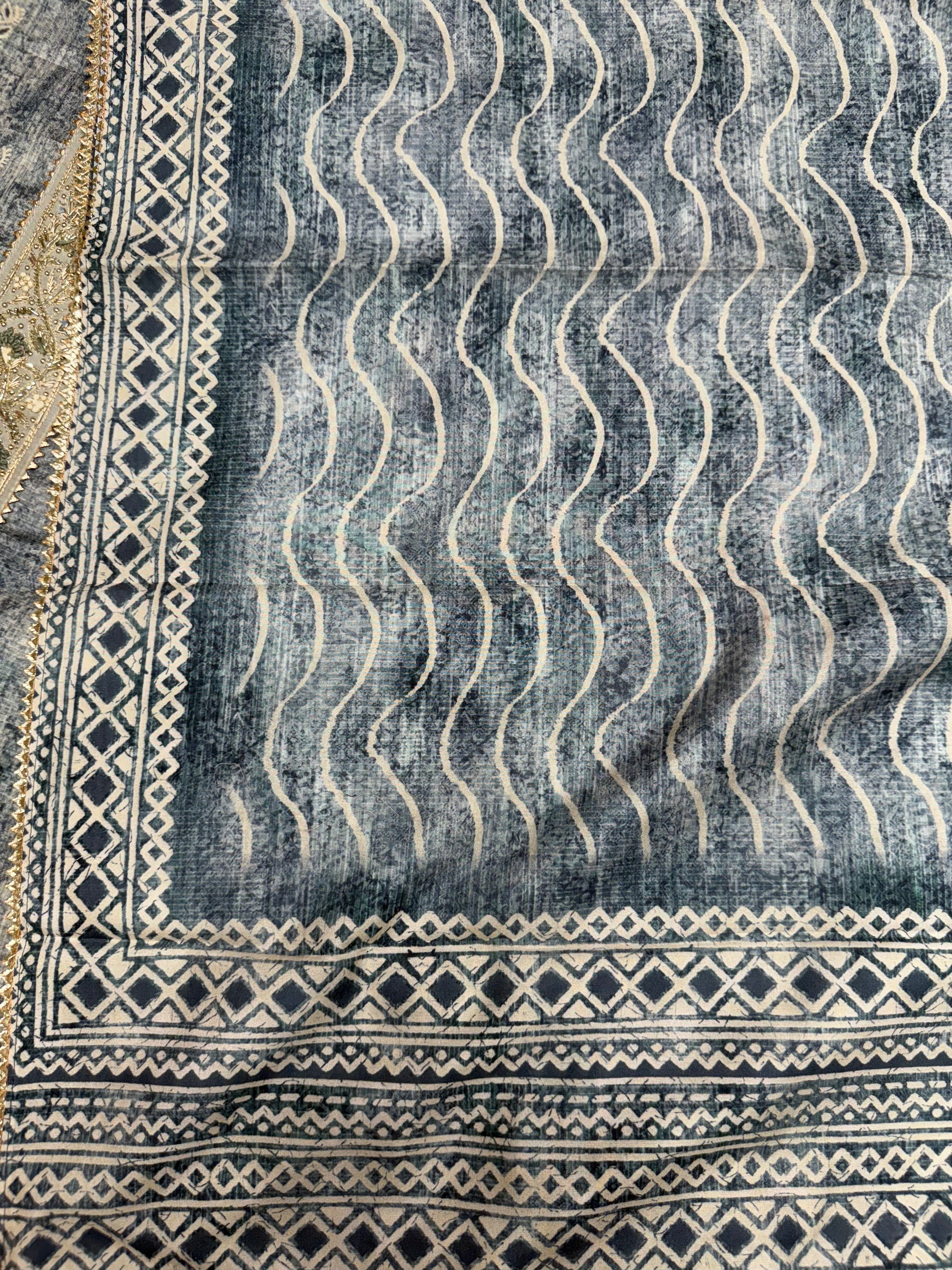 This Designer Raw Silk Dress Material in dark grey offers a luxurious, rich texture with a sophisticated finish. The raw silk fabric provides a beautiful, structured drape, making it perfect for weddings, formal occasions, and festive events.