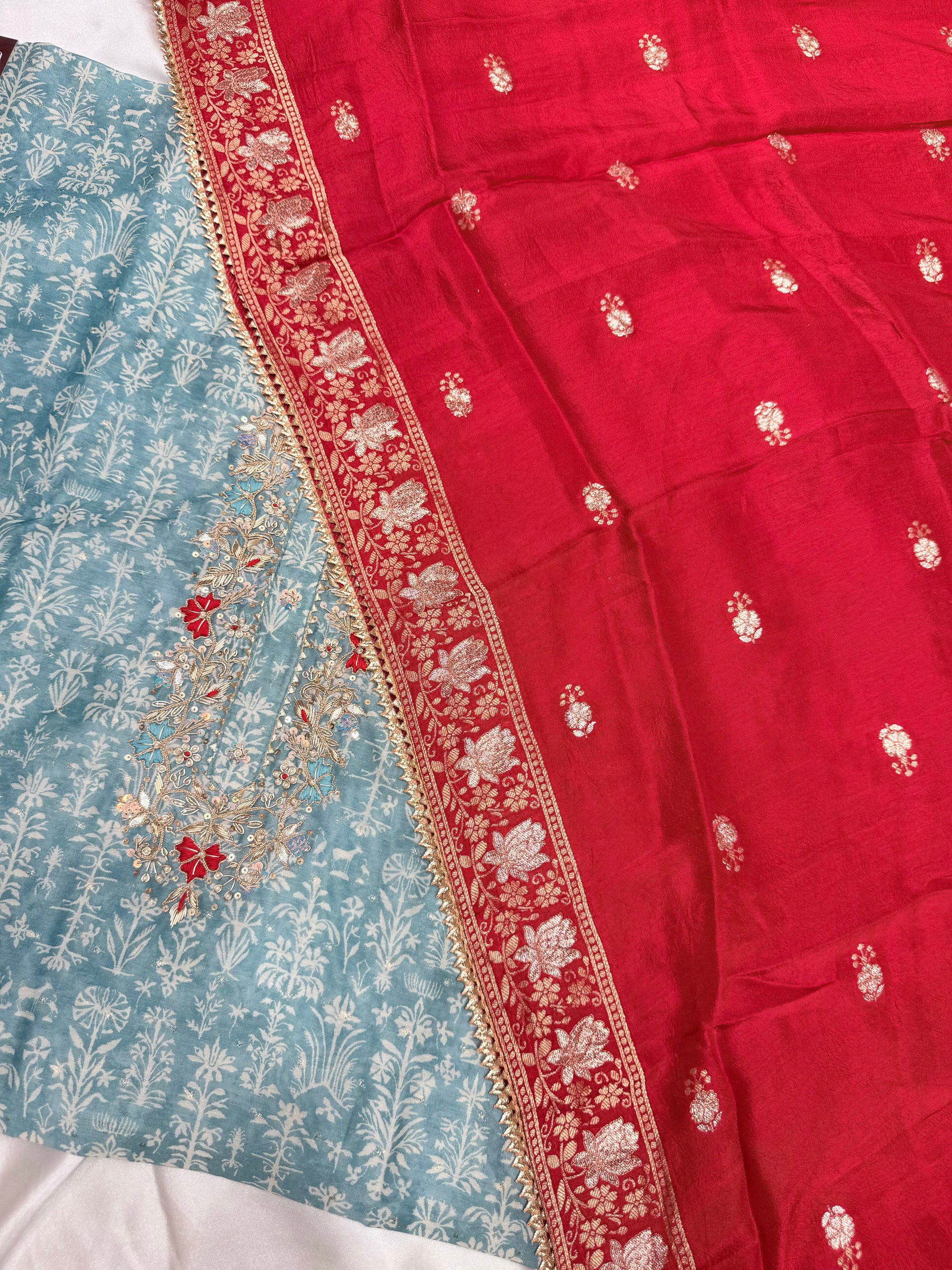 Linen silk handwork dress material with Banarasi Dupatta (sea green)