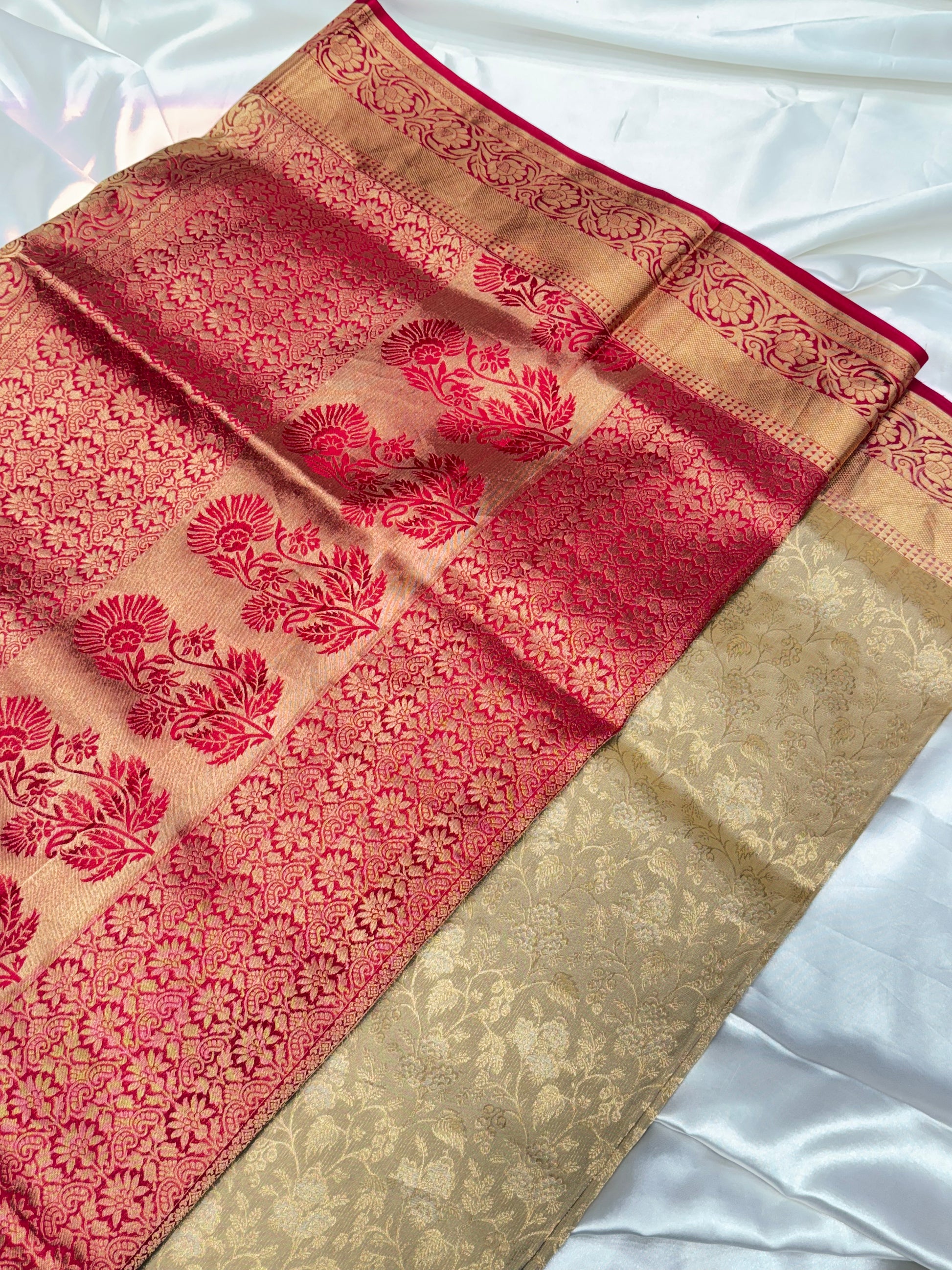 Pin-Striped Contrast Tissue Silk Saree (Beige & Red)
