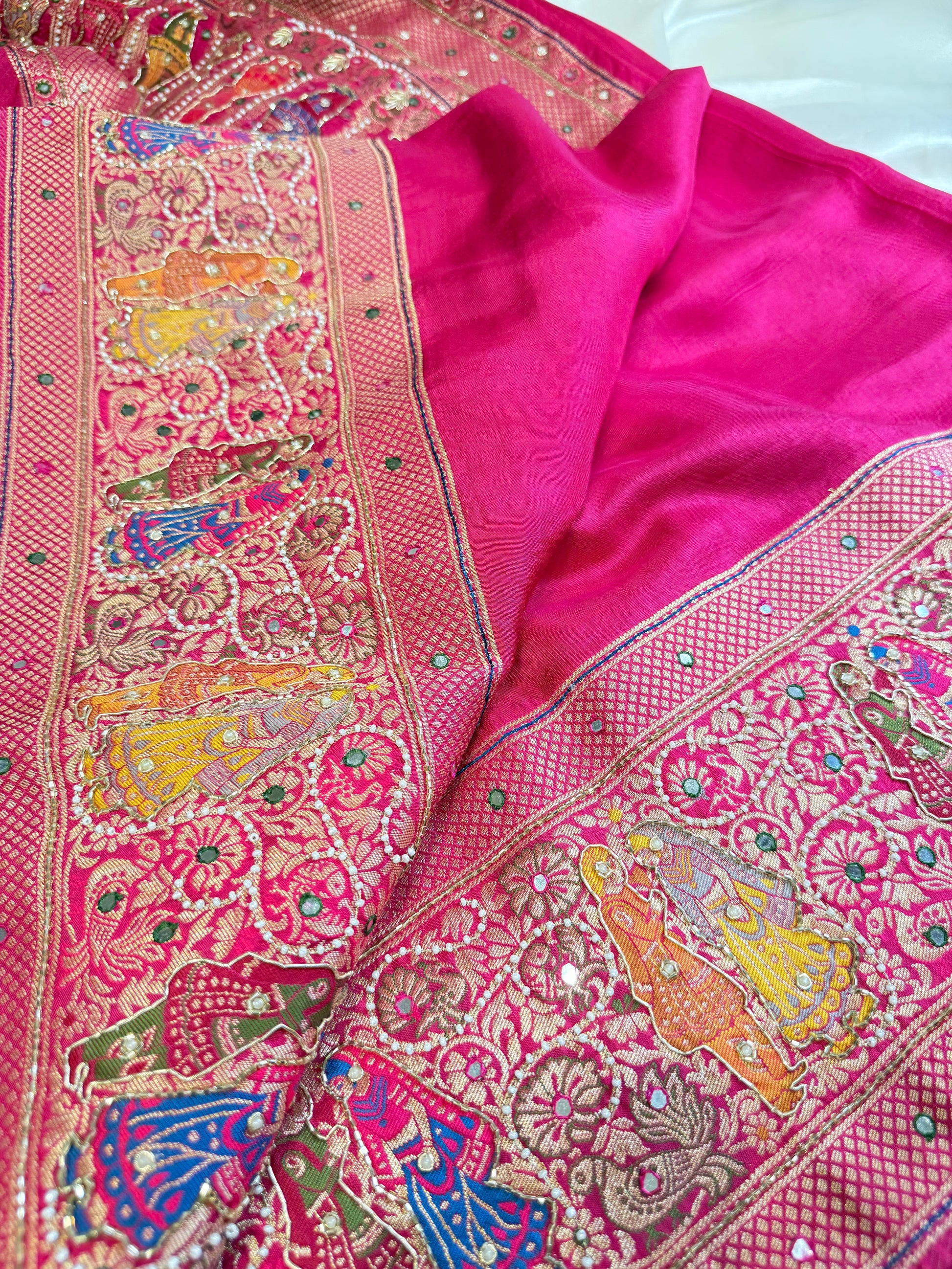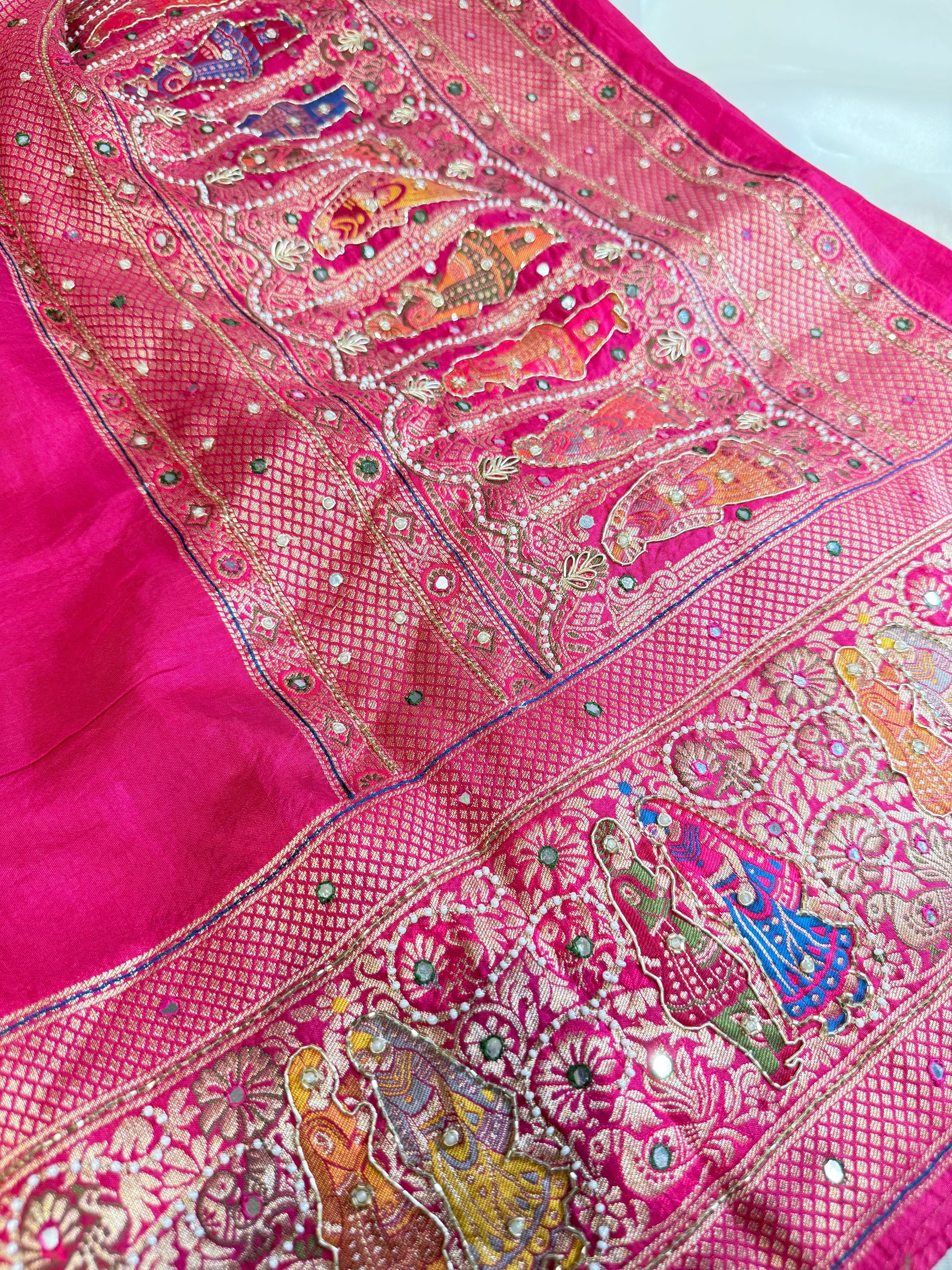 Plan Border Ajrak Silk Saree (Hot Pink)