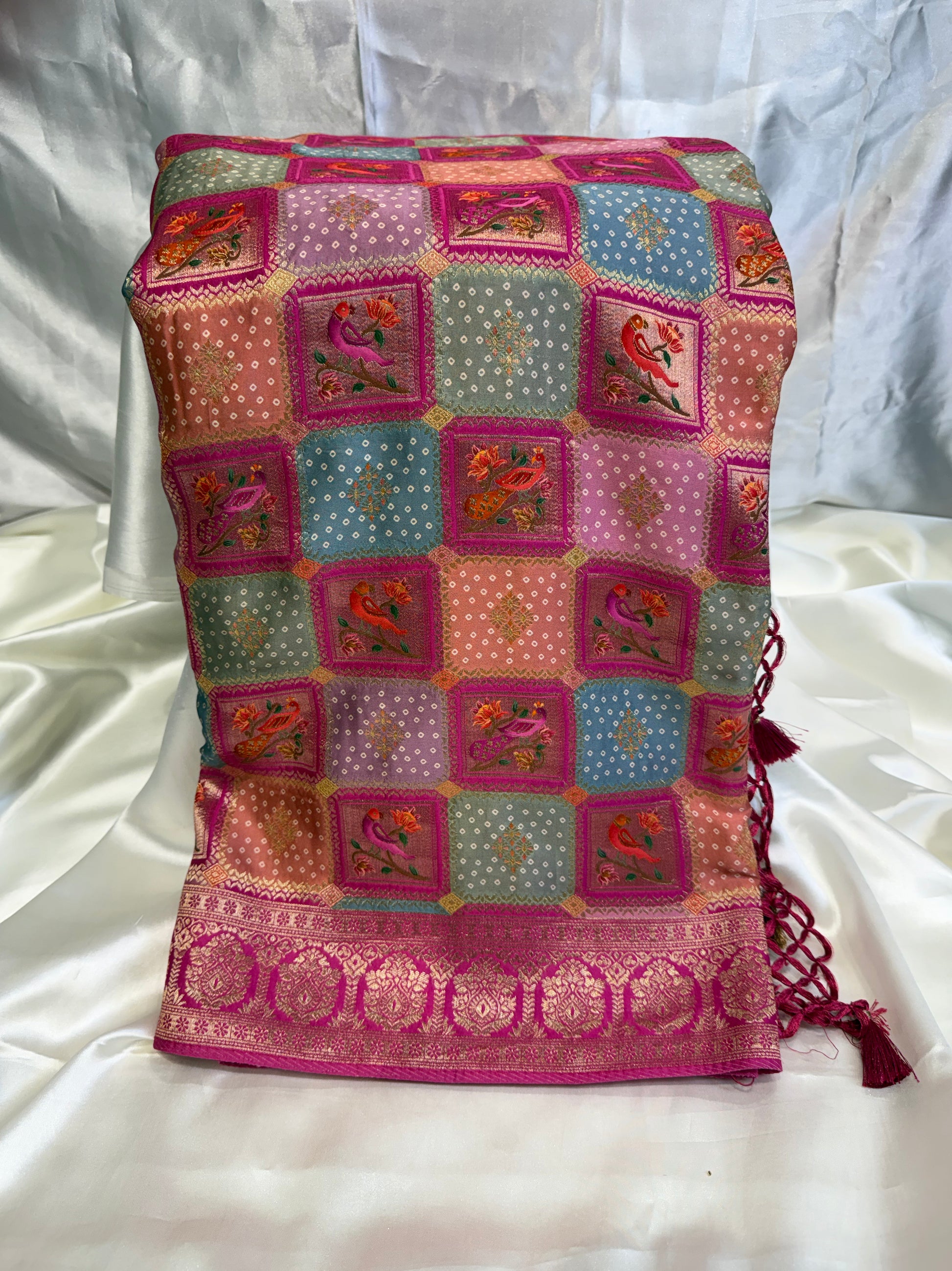 Elevate your ethnic look with this beautifully crafted Rangkat Satin Silk Saree. The smooth satin finish, paired with artistic figure work, brings a touch of elegance and uniqueness to your festive wardrobe.