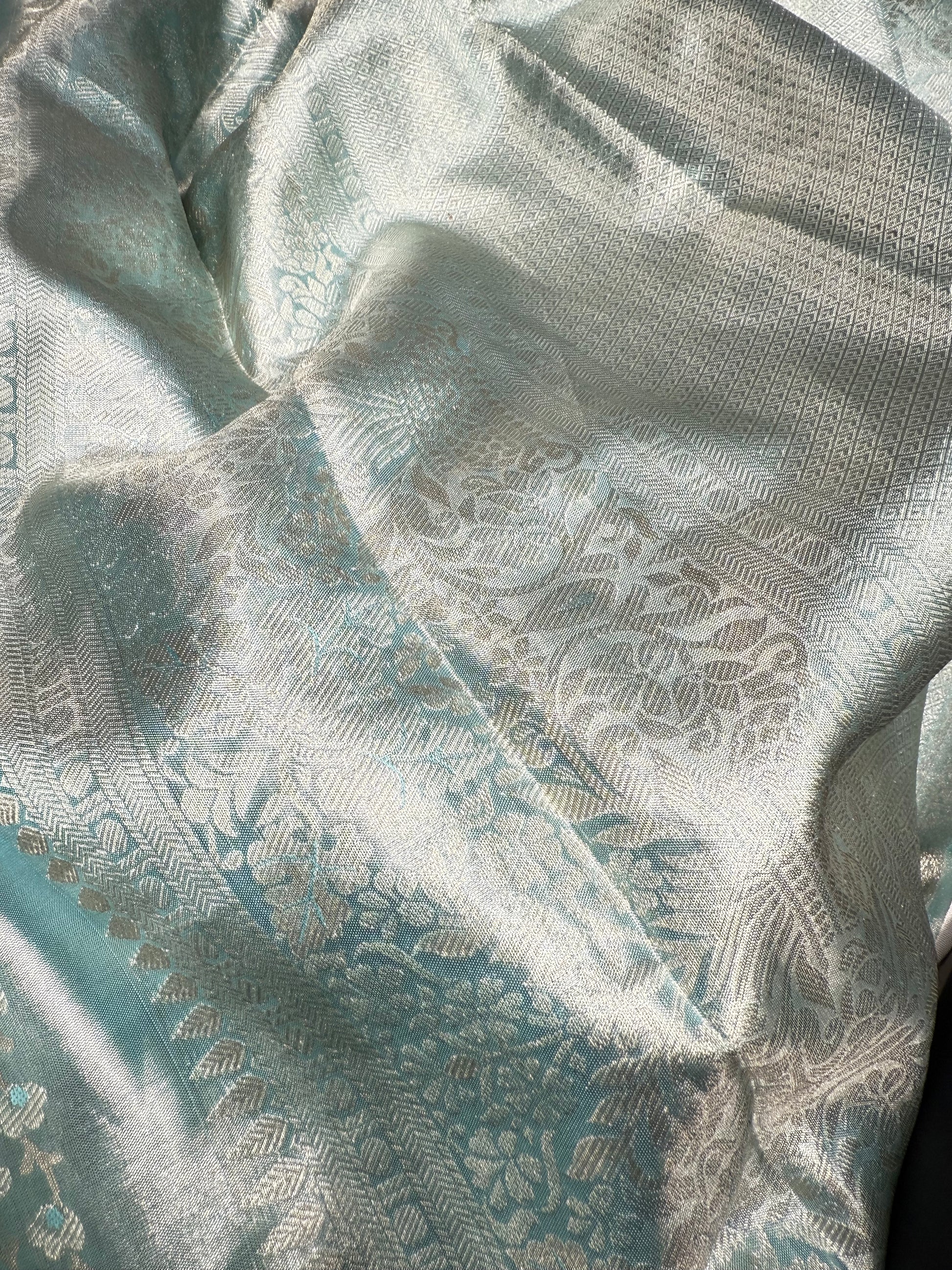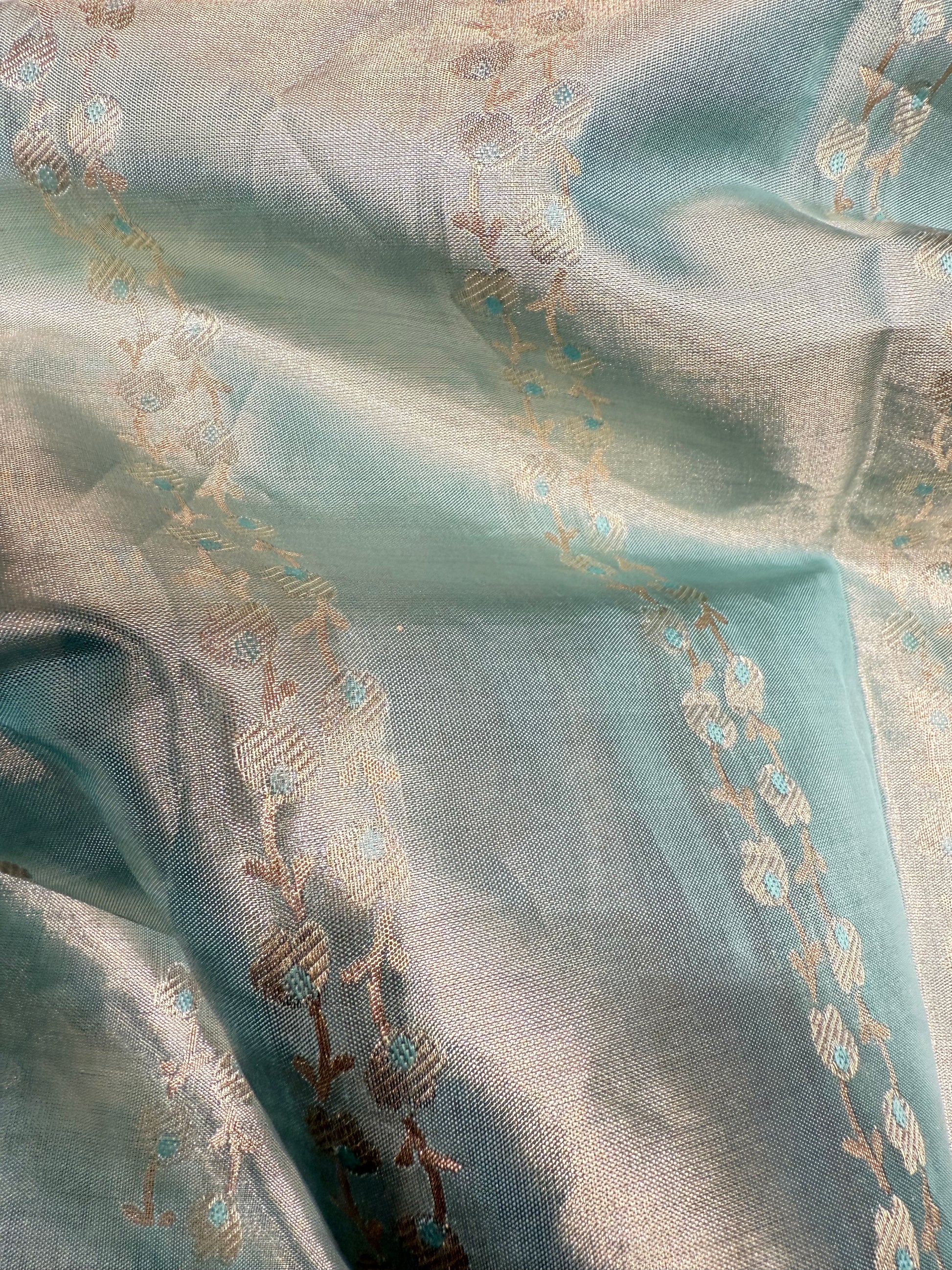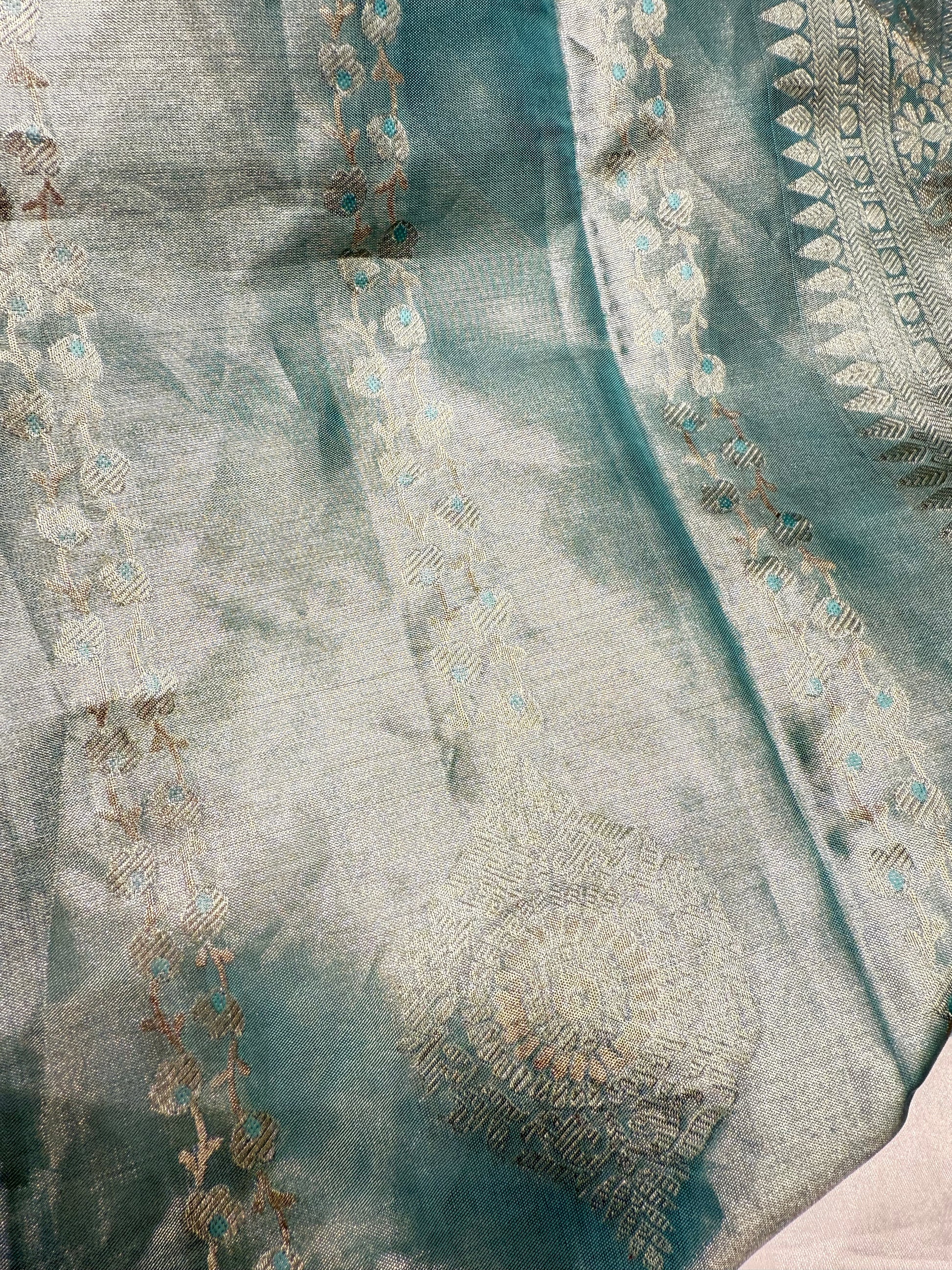 Delicate and effortlessly elegant, this Tissue Silk saree in a serene water blue shade is perfect for making a graceful statement. The lightweight, shimmery texture of tissue silk flows beautifully, adding a soft glow to your look. Whether it's a festive gathering or a formal celebration, this saree offers timeless charm with a modern color palette.